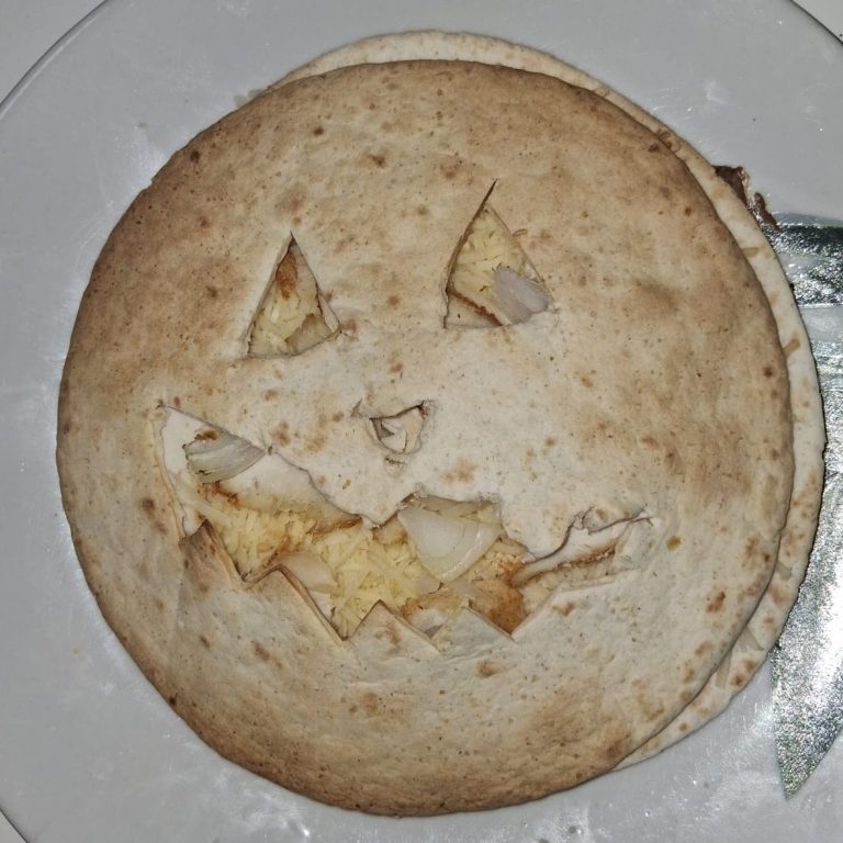 Poner en una torta de maíz el queso y el jamón york troceado. Luego recortamos la otra torta de maíz con forma de cara terrorífica y la usamos para tapar.