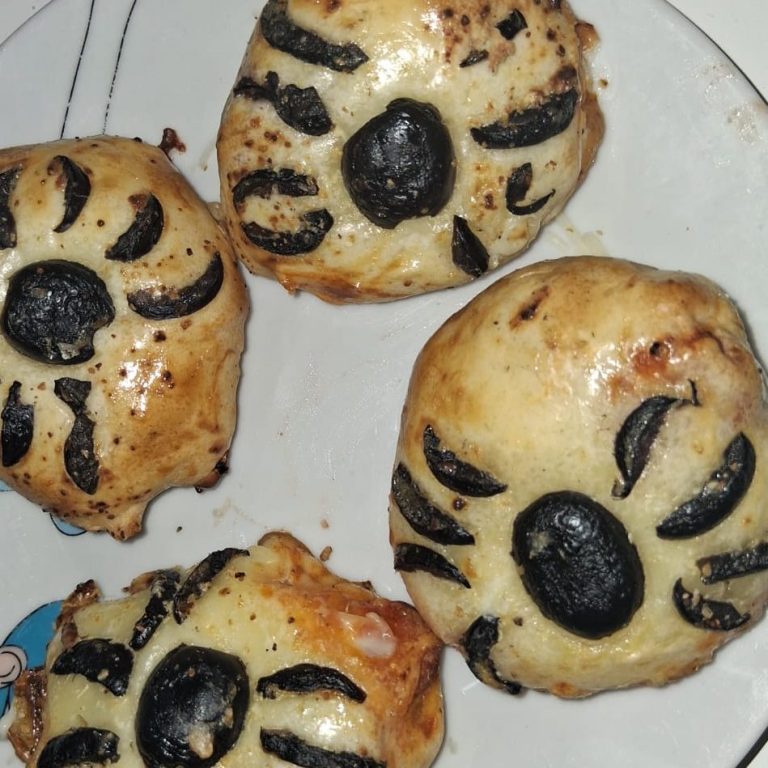 Cortamos cuadrados de masa de 10x10cm y rellenamos con salchichas troceadas el tomate y el queso. Lo cerramos y hacemos una bolita. Decoramos con media aceituna cortándolas para hacer la forma de araña.