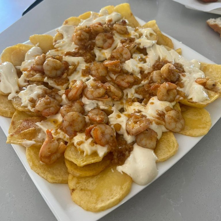 Y por ultimos montamos el plato, a las patatas calientes le ponemos 3 cucharadas de alioli y luego ponemos encima las gambas al ajillo (sin pasarte de aceite).